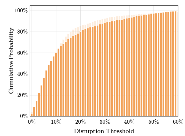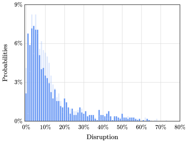De la misma manera, podemos calcular la probabilidad de que el equipo local gane si no recibe tarjetas rojas. En esos casos, la probabilidad de ganar aumenta de 45%, que es la probabilidad de ganar antes que comience el juego, a 46%, pero baja a 24% si el arbitro echa a un jugador.